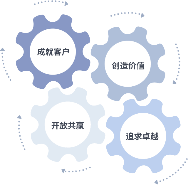 成就客户是一切决策的出发点,,创造价值是衡量所有工作的标准,,,,追求卓越是我们做事做人的态度,,开放共赢是我们的格局也是最终的结果。。。。价值观的齿轮环环相扣,,,,推动着组织里的每个人不断向前。。。